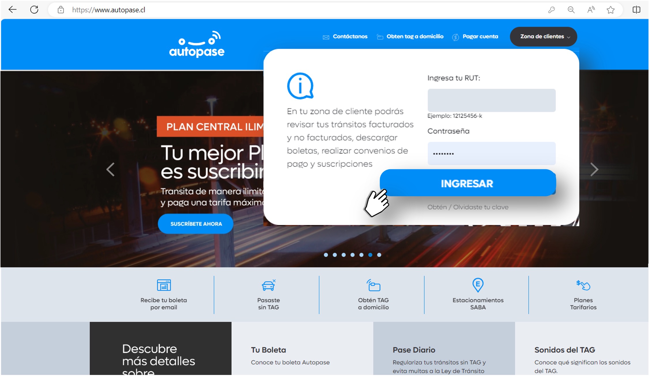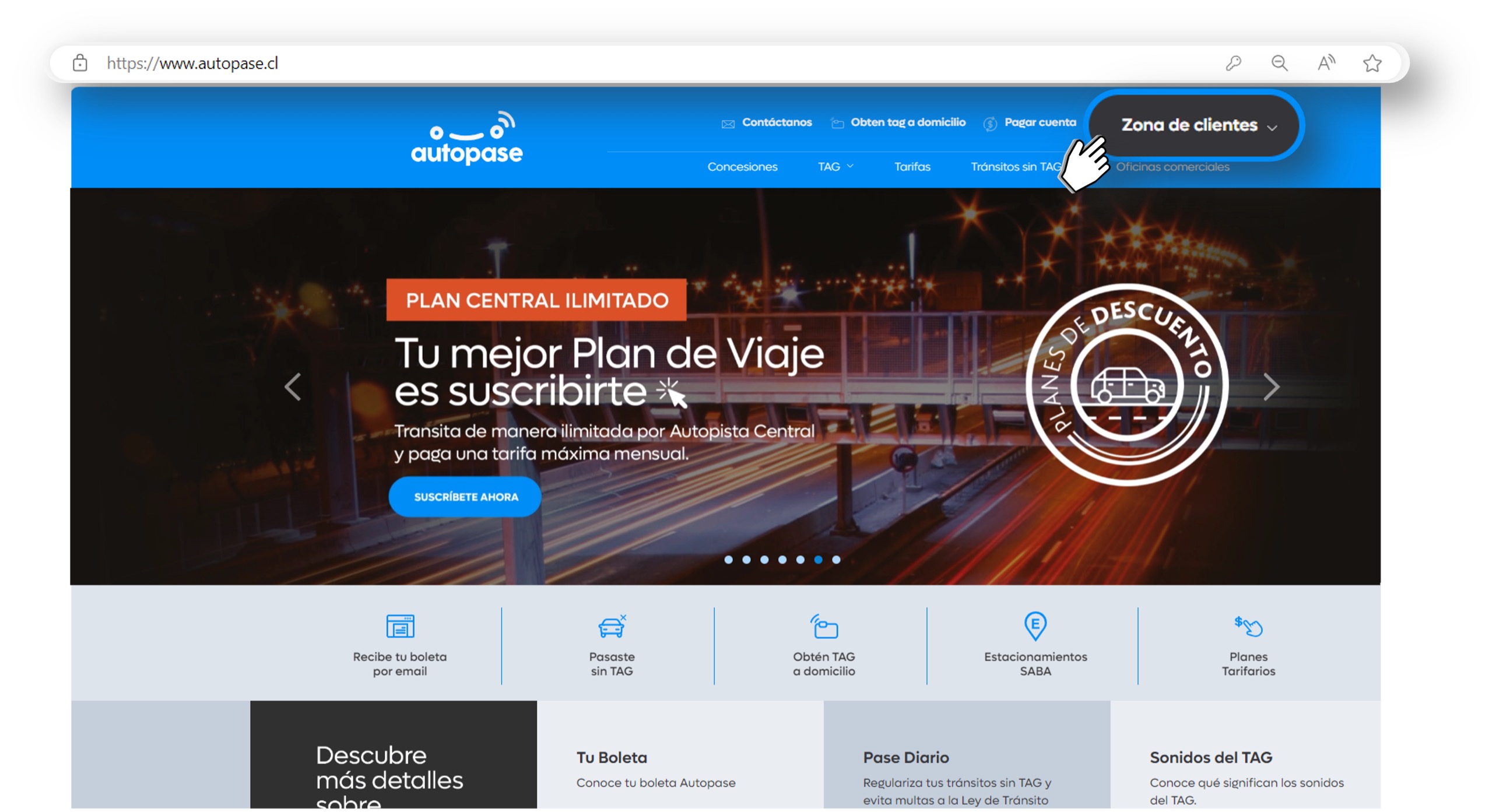 1. Ingrese al sitio web autopase.cl, luego, haga clic en “Zona de clientes”