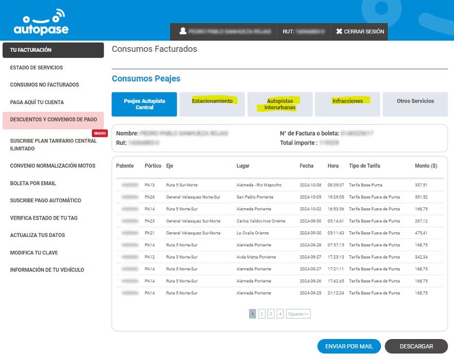 En la pantalla podrá visualizar el consumo de peajes diferenciado por: Peajes Autopista Central, Estacionamiento, Autopistas Interurbanas y Otros Servicios. Si lo desea, puede enviar el detalle por mail o descargarlo en su dispositivo