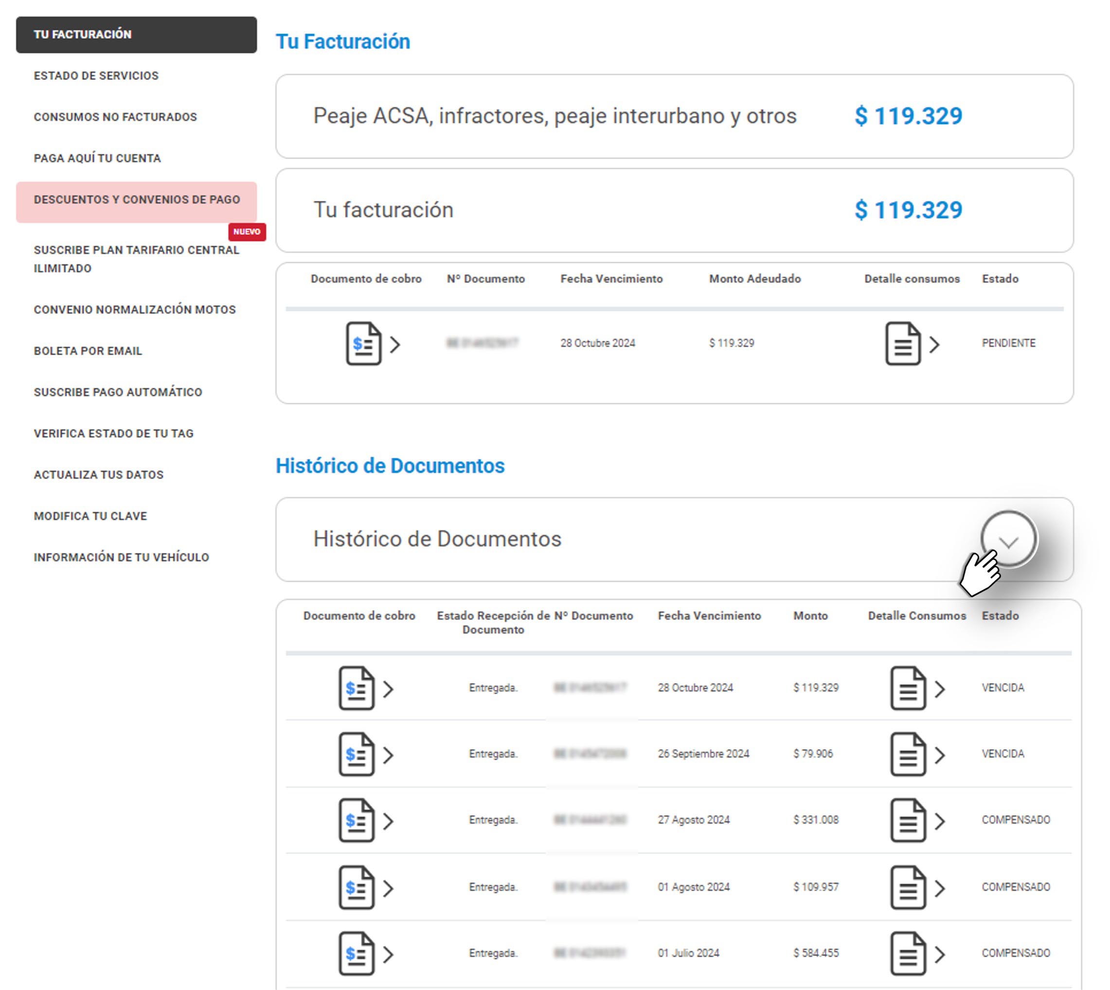 B. Ingresar inmediatamente a visualizar “Tu facturación”. En la parte inferior de la pantalla encontrará la sección “Histórico de documentos”, donde podrá observar el detalle de transacciones históricas de los 12 meses posteriores. Para visualizar el documento, haga clic en “Detalle Consumos”