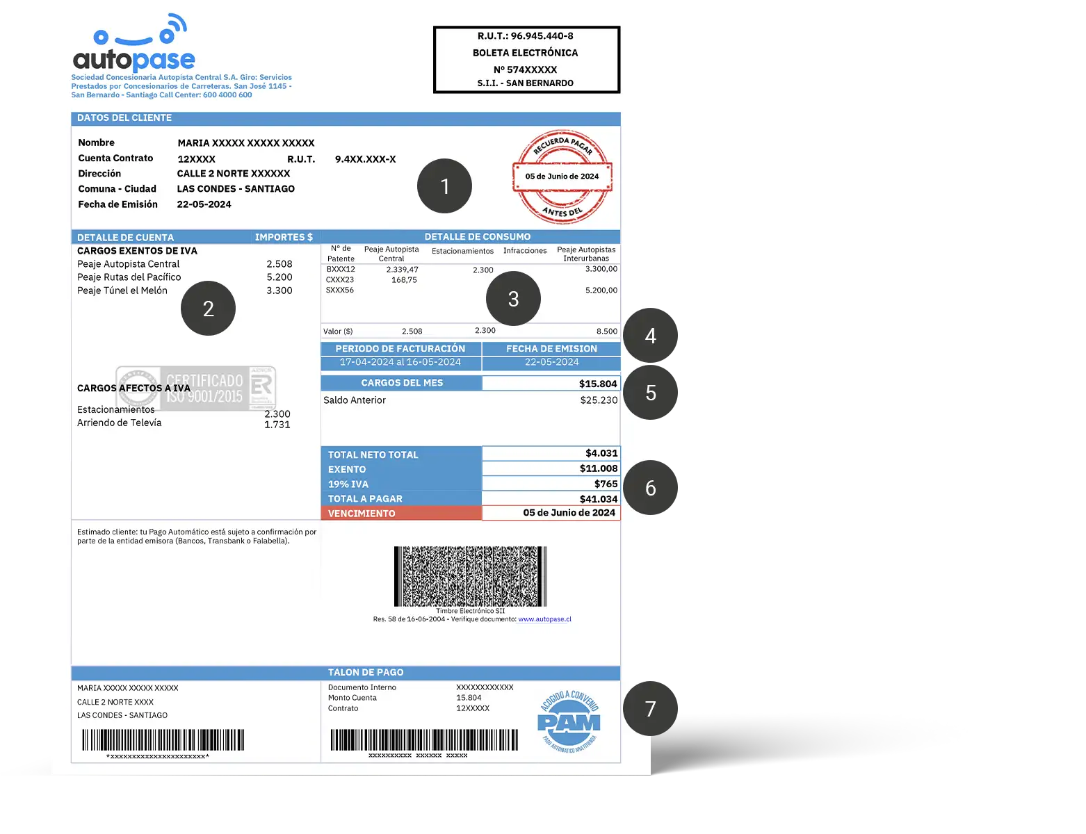 Descubre todo lo que necesitas saber sobre tu boleta de Autopase. Te explicamos en detalle cómo leerla y entender los cargos para que estés siempre informado(a). Haz clic en la sección numerada y podrás conocer la descripción asociada.