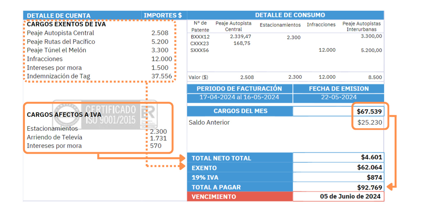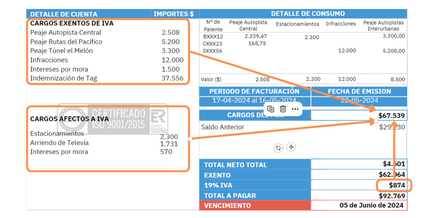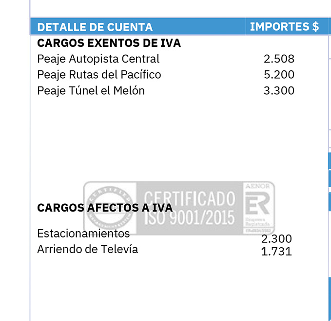 Más abajo de lado izquierdo, encontrarás la sección “Detalle de Cuenta”, donde se refleja el desglose de todos los cargos del periodo de facturación, existiendo montos exentos de IVA, como peajes, infracciones, intereses por mora y indemnización de tag, este último se realiza cuando realizaste un término de contrato y no devolviste el dispositivo TAG. También podrás ver montos afectos a IVA como por ejemplo, uso de estacionamientos SABA, arriendo de televía (dispositivo TAG) e intereses por mora: