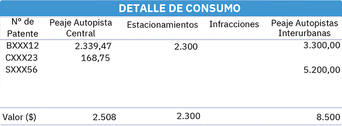 Al lado derecho, en la sección de “Detalle de Consumo” encontrarás los distintos consumos asociados a las patentes registradas y los montos totales de cada consumo: